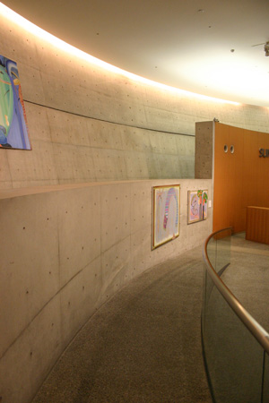遠遠朝向美術館走去,只覺造型奇異,並不覺得建築體的巨大,近身抬頭一望,頓時感受到這座倒圓錐建築的尺度之巨,迫人的壓力油然而生。安藤以極不規則的幾何造型,堆疊成這座巨大的建築體,若從天空俯瞰,三得利美術館像是小朋友不小心推倒的積木般,寧靜地倒臥在海岸邊上。主要作為藝術展出的美術展覽室,以IMAX 3D動畫劇場(倒立圓錐體)為中心,兩側向外延伸,環繞著店家、咖啡廳等複合式空間。在這裡,不僅看建築、看畫,更多的是看電影、看海景,多元的休閒活動內容消磨時光。