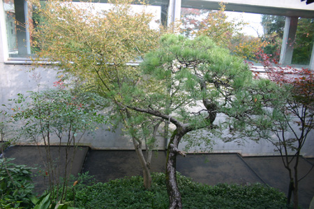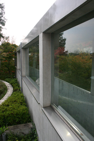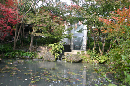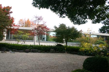 京都山城起伏的韻律,不只服貼著古老的廟宇,依山傍水,名人府邸也是如此。大山崎山莊是一棟將近百年的舊房子,造訪京都時一併請友人帶領造訪。11月的京都,已是一片火紅,大山崎山莊位於山上,楓紅更熾,慢走一段山林小徑,穿越有如磚造拱橋的壁洞,便是這座以私人別墅為基礎,結合小型美術館與自然景觀的美術館。