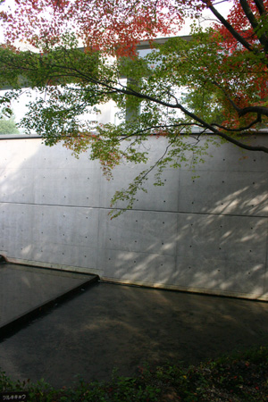 大山崎山莊仍保留著20世紀初,日本建築深受歐風影響的痕跡,是一座東洋味十足的歐式建築,由安藤設計的美術館建築則是非常低調地融入環境,梯田狀水渠順著山坡陵線走,包裹著進入美術館的通道,人在玻璃通道上行進時,看見水、看見滿山楓紅,走在百年建築,也走在當代空間裡。