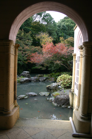 大山崎山莊洋風十足的拱型柱,與庭園景觀構成日式洋風韻味。