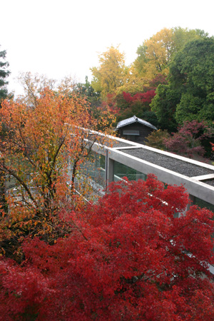 從美術館頂部看通道,灰色走道低調地融入滿山紅葉裡。