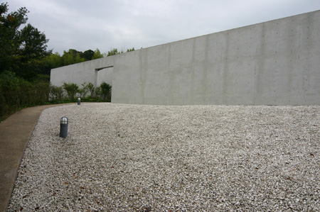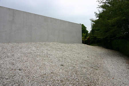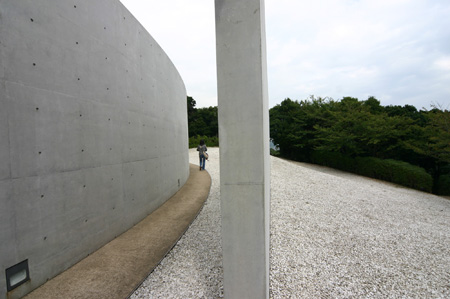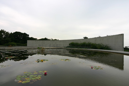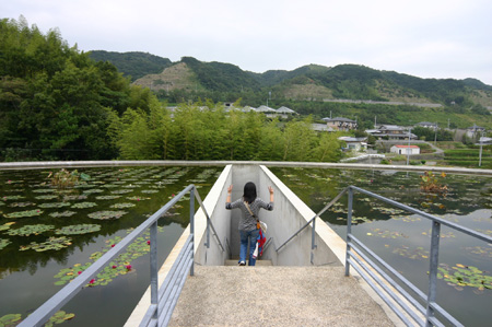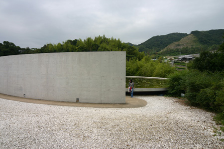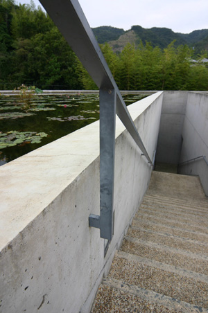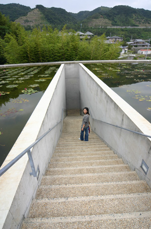 進入水御堂的過程極富戲劇性,挑戰身體感官的極限,也挑戰心理感知的極限。車子到站後,水御堂的入口是一座老廟,過廟,出現在眼前的是一片墓地,而後是一大面曲線牆,延著順時鐘的方向向內捲曲,一個曲折、再一個曲折,人彷彿也成為迷宮裡曲折線上飛行的一葉,冉冉地飄升,走至底,視覺豁然開朗,出現在眼前的竟是一片蓮花池。