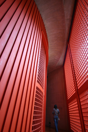 池中,開出一條階,人彷彿是撥開團團聚湧的花、葉,探入淨土世界。深盤座落在池底的水御堂,一個與世隔絕的空間。隔著東方的朱色格子窗,裡是廟宇,外是中庭,光穿透朱色窗,漫散成一格格祥光,寧靜祥和,莊嚴肅敬。