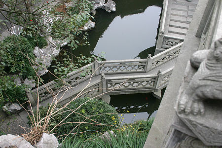 站在建築高處,俯瞰園林曲折的橋。